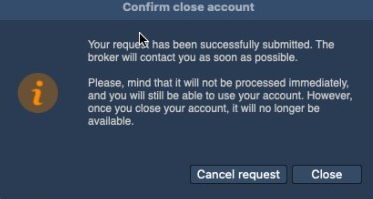 By clicking the “Send request” button the request for closing an account is created and the following screen with ability to cancel a request will appear: