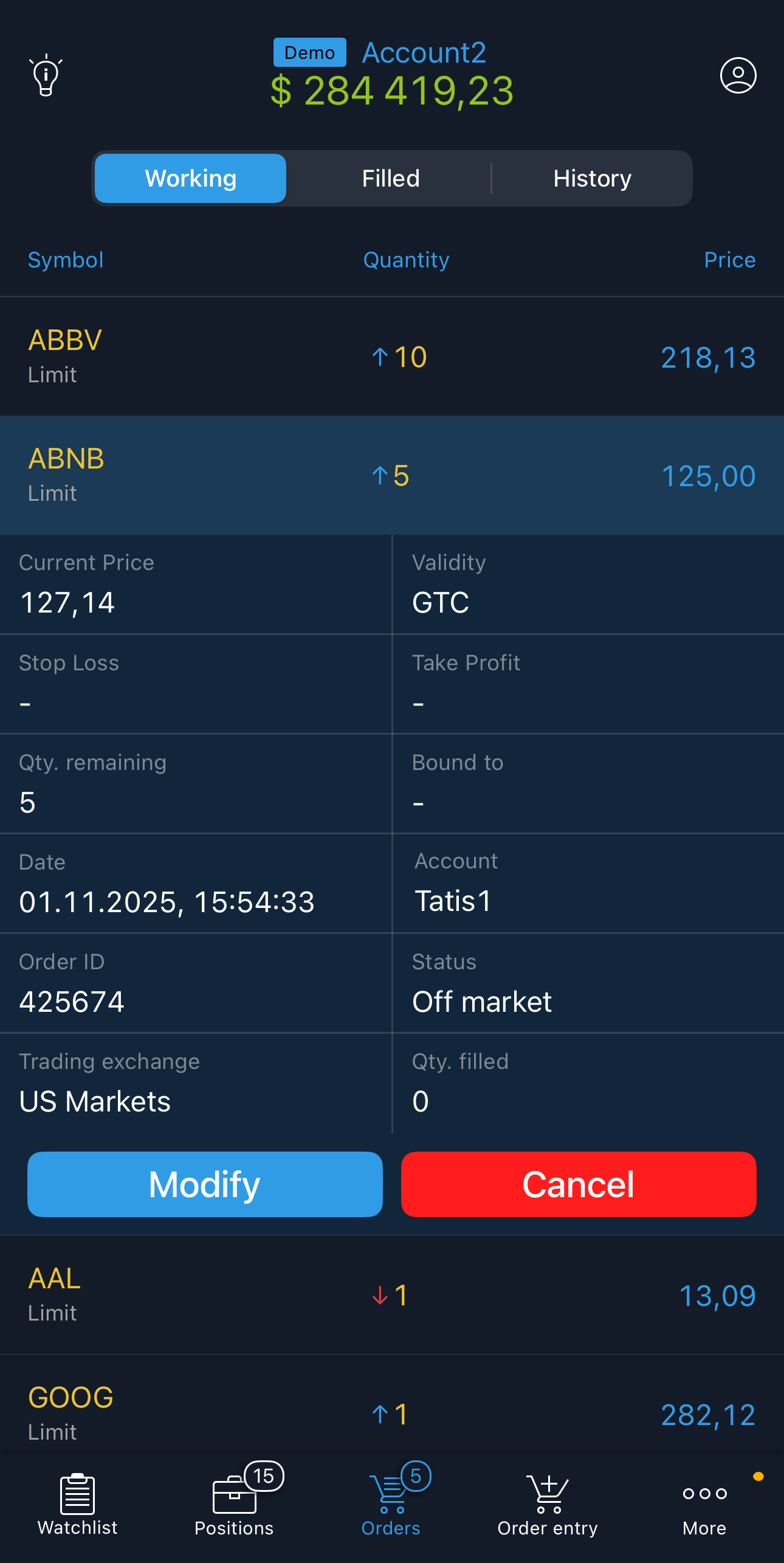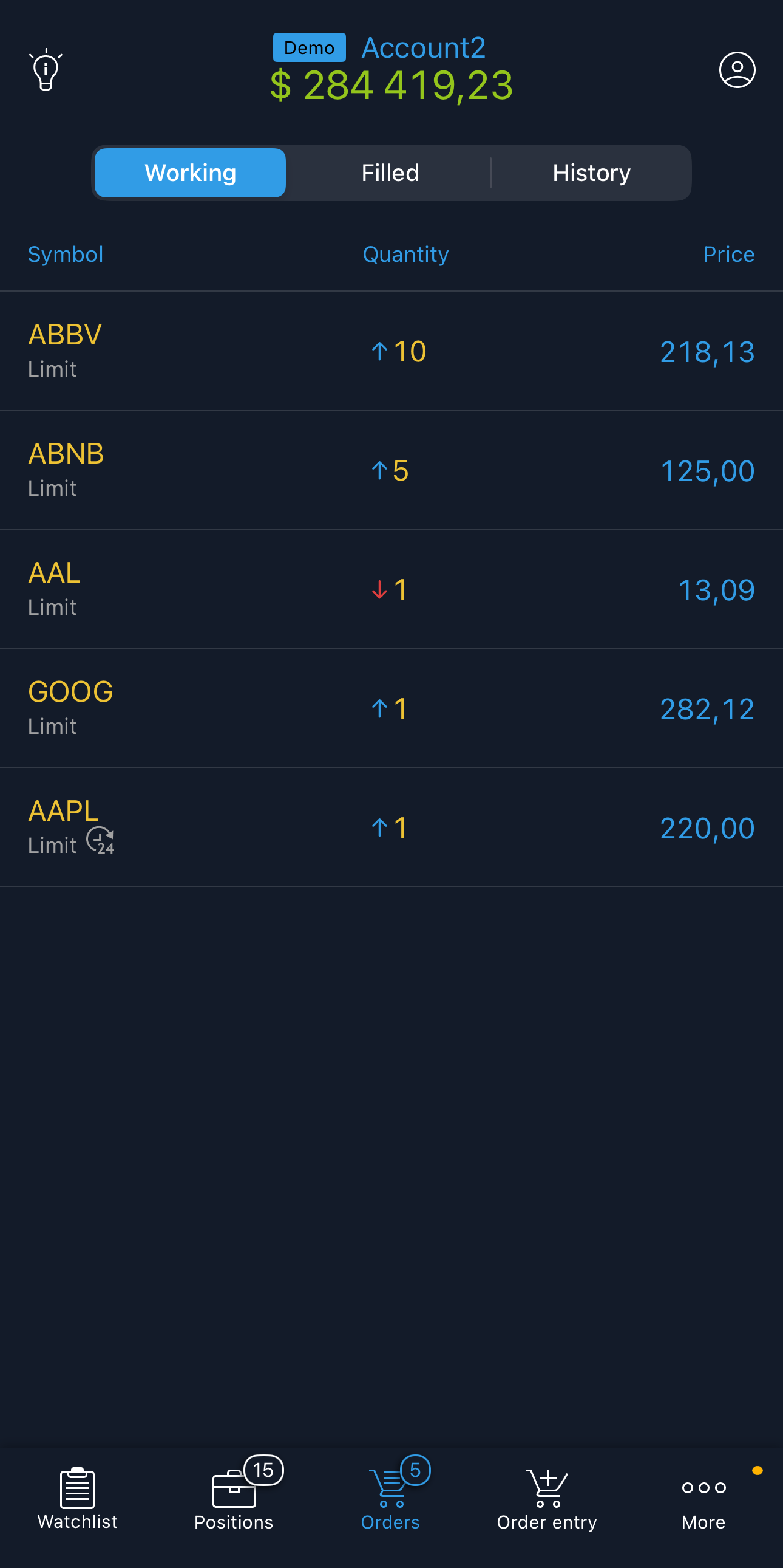Each section consists of the cards list with short information about the orders: for Working orders – symbol name, quantity, open price, order type; for Filled orders – symbol name, order type, Net P/L, quantity. In order to get full information about the symbol on which the order was created, tap the symbol name.