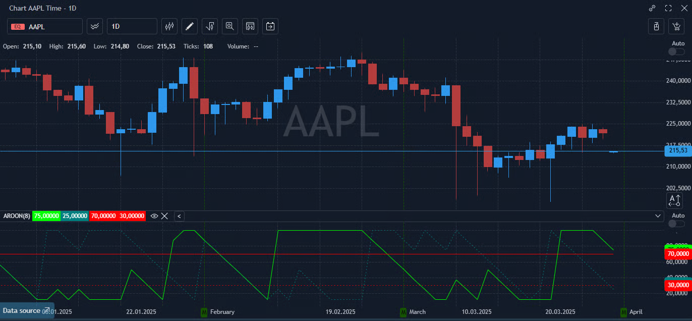 The Aroon indicator was developed by Tushar Chande in 1995, it is an indicator system that determines whether a stock is trending or not and how strong is the trend. The Aroon indicators measure the number of periods during which the price has reached an x-day high or low. There are two separate indicators: Aroon-Up and Aroon-Down. Both lines fluctuate between 0 and 100. The lower the number for Aroon up, the weaker the uptrend, and the lower the number for Aroon down, the weaker the downtrend. When the rising Aroon line is above the falling Aroon line, an uptrend is indicated. When the down line is above the up line, a downtrend is indicated. High values ​​of the Aroon ascending line mean that the price is trading at new highs over a certain period of hindsight. High values ​​of the Aroon descending line mean that the price is trading at new lows for a certain period of hindsight. A value of 100 for an up line indicates a potential emerging uptrend, and a value of 100 for a down line indicates a potential developing downtrend.